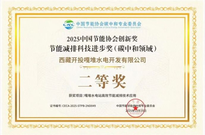近日,中國節能協會2025年度創新獎獲獎名單正式公布,西藏開投嘎堆水電公司申報的“嘎堆水電站高效節能減排技術應用”項目榮獲“節能減排科技進步獎(碳中和領域) 二等獎”。