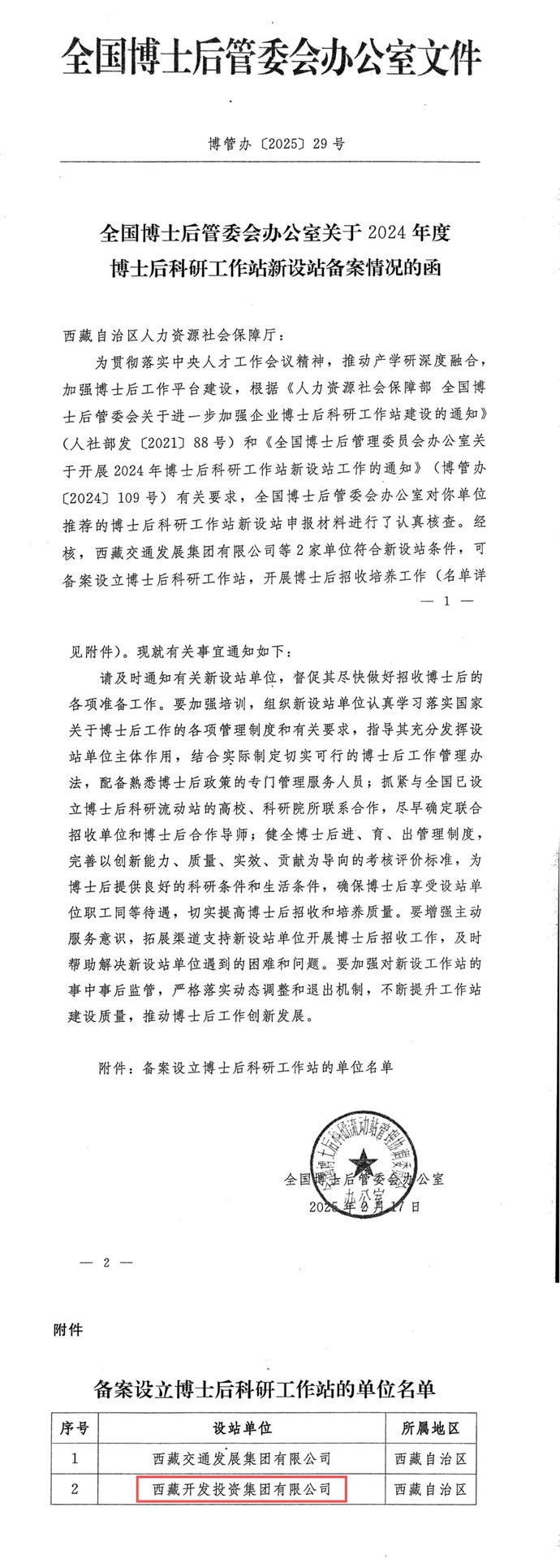 近日,全國博士后管委會辦公室公布了《關于2024年度博士后科研工作站新設站備案情況的函》,西藏開投集團成功獲批設立博士后科研工作站,標志著集團在科技創新和人才培養方面邁上新臺階,將為推進集團清潔能源產業高質量發展注入強勁動力。