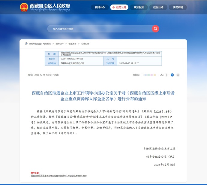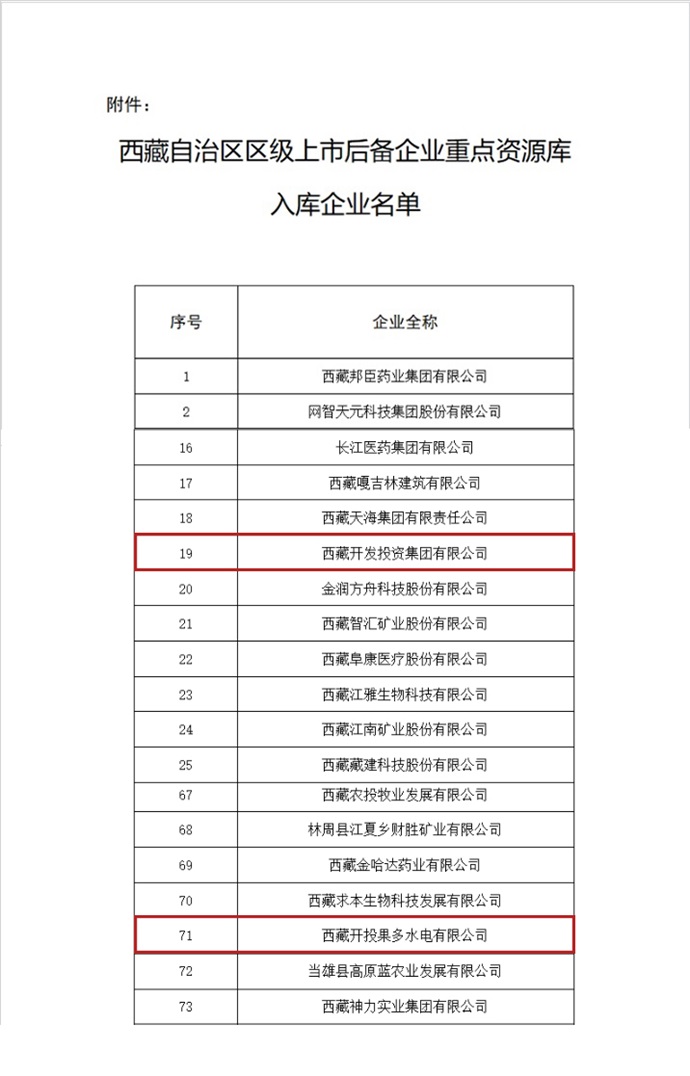 為積極響應自治區人民政府《西藏自治區推進企業上市“格?;ㄐ袆?rdquo;計劃》等文件精神,經過自愿申報、主管部門初審、專家評審和公示等程序,近日,西藏自治區推進企業上市工作領導小組辦公室公布了全區上市后備企業資源庫名單。西藏開發投資集團有限公司和西藏開投果多水電有限公司兩家企業成功入選西藏自治區“格?;ㄐ袆?rdquo;計劃重點上市后備企業資源庫。