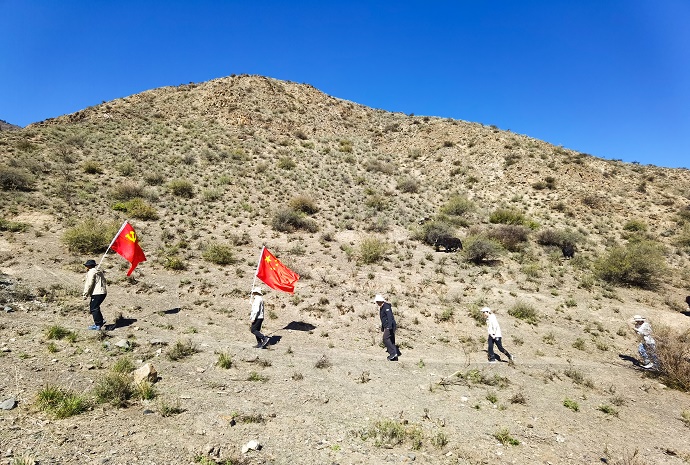此次踏勘全程22公里,海拔垂直高度1200米。9時(shí)30分,新能源公司踏勘人員肩抗黨旗、國旗,背負(fù)測(cè)量設(shè)備和儀器從山腳沿項(xiàng)目進(jìn)場(chǎng)道路出發(fā)。在徒步上山過程中,天氣炙烤灼人,大家三五隨群,或健步直沖或駐足而立,或仔細(xì)測(cè)量或落筆記錄,或討論工作或抒懷暢想。大家互相幫助、互相鼓勁,隨著海拔的不斷攀升,身體負(fù)重不斷加大,氣息開始急促、腳步不再有力,每前進(jìn)一步都特別的困難,但眼前的大山壯闊雄渾,遠(yuǎn)處的冰川雪景圣潔空靈,頭頂?shù)奶炜照克{(lán)纖塵不染,讓大家心曠神怡,真切感受到高度是一種境界,攀登是一種追求,是一種“小天下”的胸懷和氣魄!