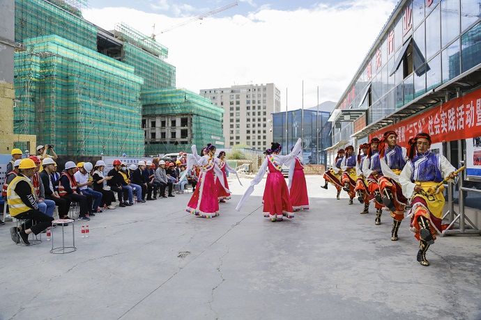 在能源基地項目現場,青春洋溢的大學生隊員們以特色舞蹈展現了西藏地方文化。西藏大學帶隊老師向工人代表贈送了應急處置知識包,并向參建工人普及日常應急知識。隨后,師生們在集團公司安全監管人員的帶領下,參觀了能源基地項目。