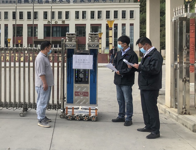 (公司領(lǐng)導(dǎo)給門衛(wèi)講解防疫要求 鄭永山攝)