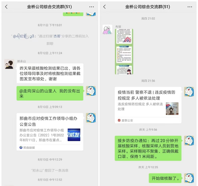 付少龍通過微信工作群及時將區、市、縣、公司疫情防控工作決策部署、防控政策措施、疫情防控違法違規行為等傳達給全體員工,引導員工做好自身防護的同時,做到不信謠、不傳謠、不恐慌、不松懈。
