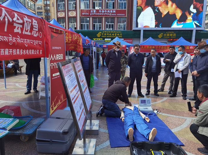本次活動,果多水電公司向市民展示了心肺復蘇法操作演示、正壓式空氣呼吸器和安全帶等應急救援器材的正確使用方法。昌都市委常委、常務副市長吳應海,昌都市政府副秘書長張耀暉,昌都市應急管理局黨委書記霍映章一行到果多水電公司安全宣傳展臺參觀了心肺復蘇法演示,并對果多水電公司本次活動給予好評。