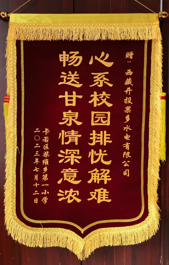 捐贈現場,果多水電公司董事長、總經理宋亞東與校長李松林親切交流,了解孩子們學習、生活情況,鼓勵孩子們要好好學習,保持樂觀向上的心態,健康快樂成長。作為受助方,李松林向果多水電公司贈送“心系校園排憂解難 暢送甘泉情深意濃”錦旗以表謝意。他表示,愛心無價,情誼永恒,全校師生將把這份關愛化作砥礪前行的動力,努力提高柴維鄉教育教學質量,培養出德、智、體、美、勞全面發展的新時代好少年。