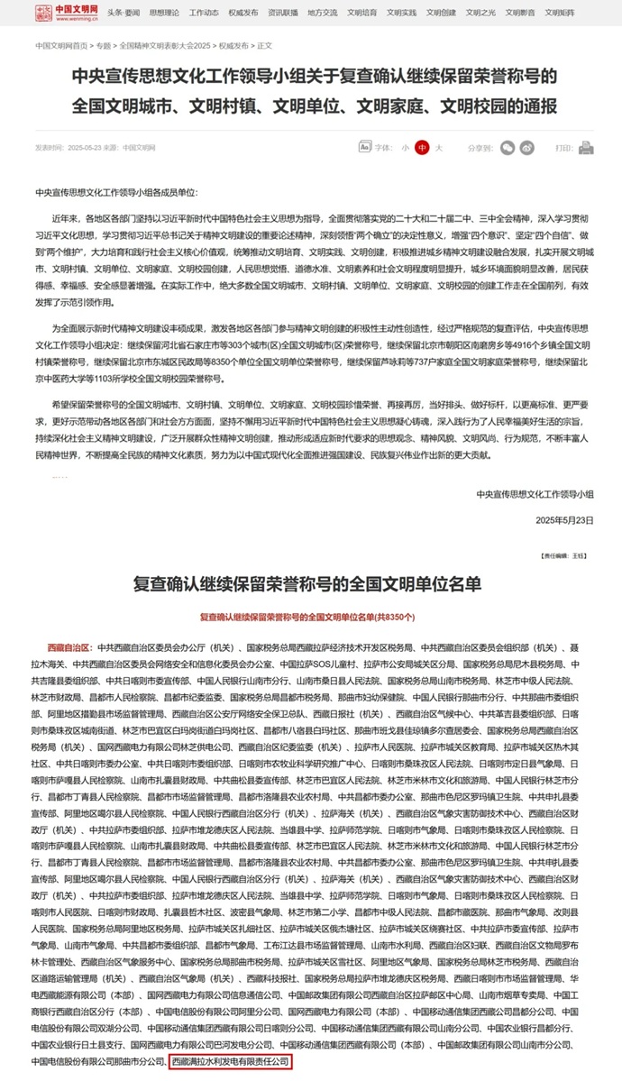 延續17年!滿拉水電公司再獲“全國文明單位”榮譽稱號