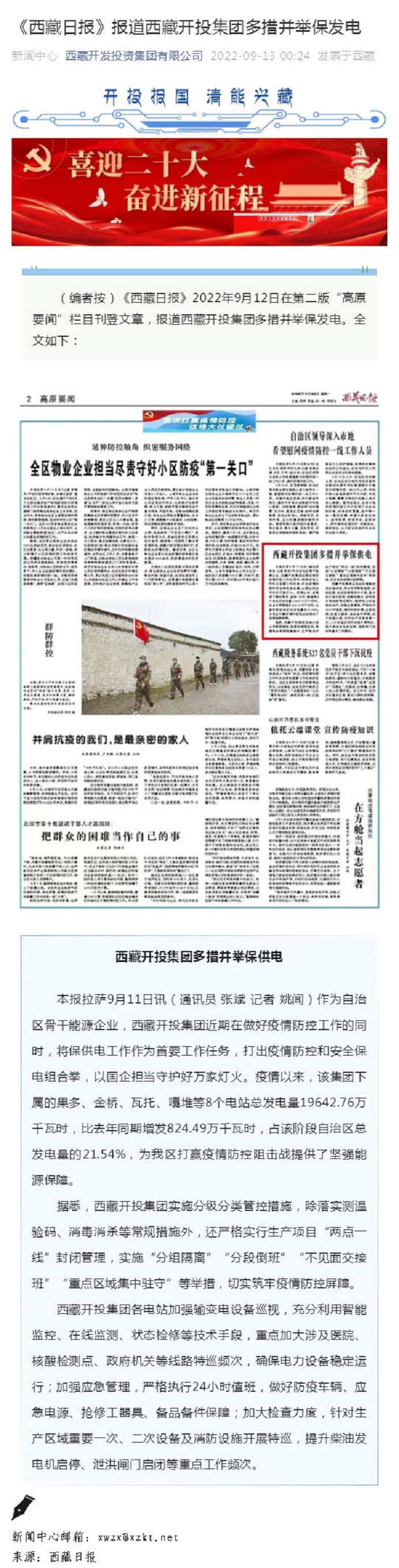 【西藏日報】報道西藏開投集團多措并舉保發電