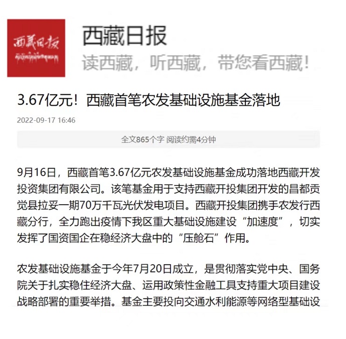 (編者按)《西藏日報》2022年9月17日報道西藏首筆農發基礎設施基金落地西藏開投集團。全文如下: