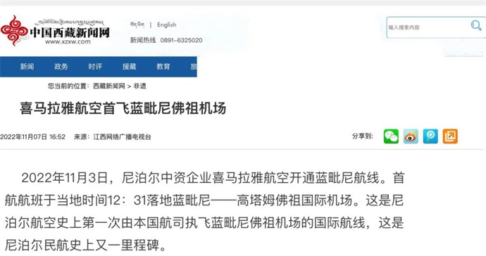 中華網、中國網、中企網、中國日報、光明日報、中國旅游新聞網、中國西藏新聞網、拉薩新聞網等媒體報道喜航開通加德滿都至藍毗尼航線