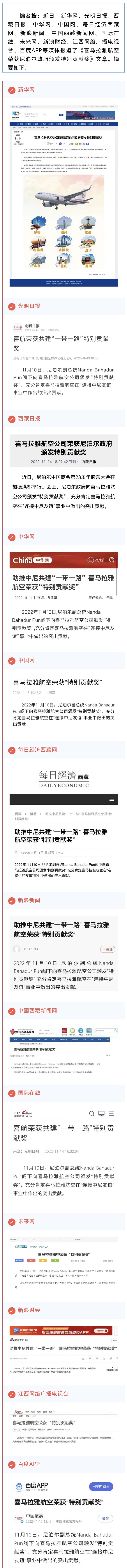 新華網、光明日報、西藏日報、新浪新聞、中國西藏新聞網等13家媒體報道喜馬拉雅航空榮獲尼泊爾政府頒發特別貢獻獎
