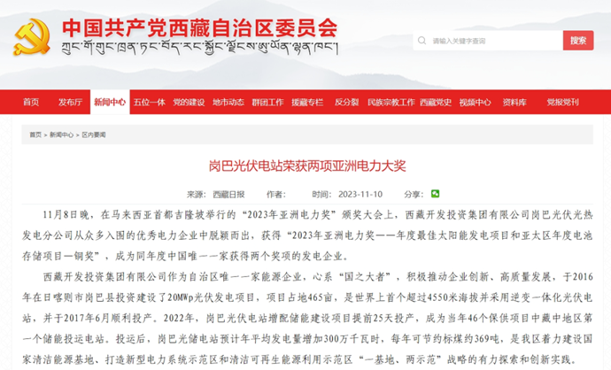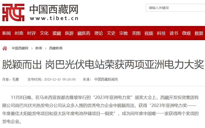 編者按:11月9-10日,科技日?qǐng)?bào)、西藏日?qǐng)?bào)、西藏日?qǐng)?bào)客戶端、新浪財(cái)經(jīng)客戶端、中國西藏網(wǎng)、中國共產(chǎn)黨西藏自治區(qū)委員會(huì)官網(wǎng)、中國共產(chǎn)黨拉薩市委員會(huì)官網(wǎng)等多個(gè)媒體報(bào)道了《西藏開發(fā)投資集團(tuán)有限公司崗巴光伏電站榮獲2023年度兩項(xiàng)亞洲電力大獎(jiǎng)》。全文如下: