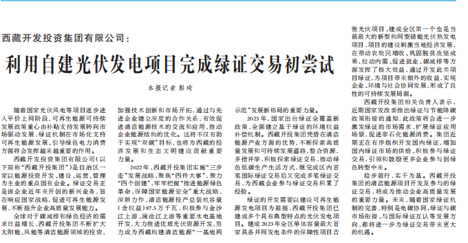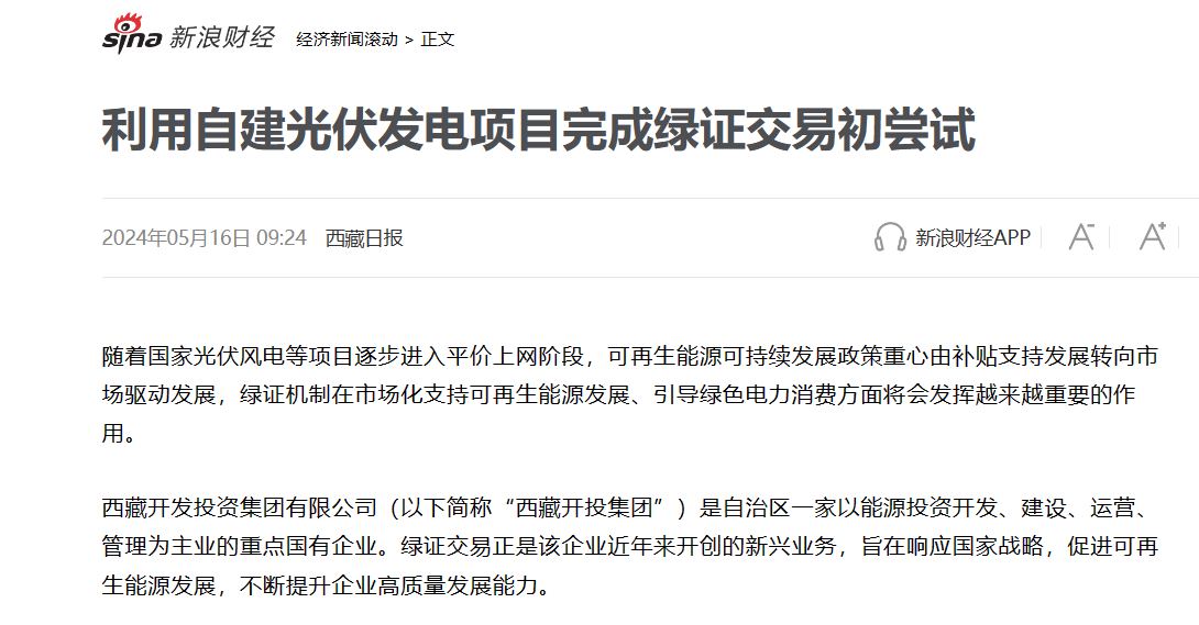 西藏日報、新浪財經等媒體報道利用自建光伏發電項目完成綠證交易初嘗試