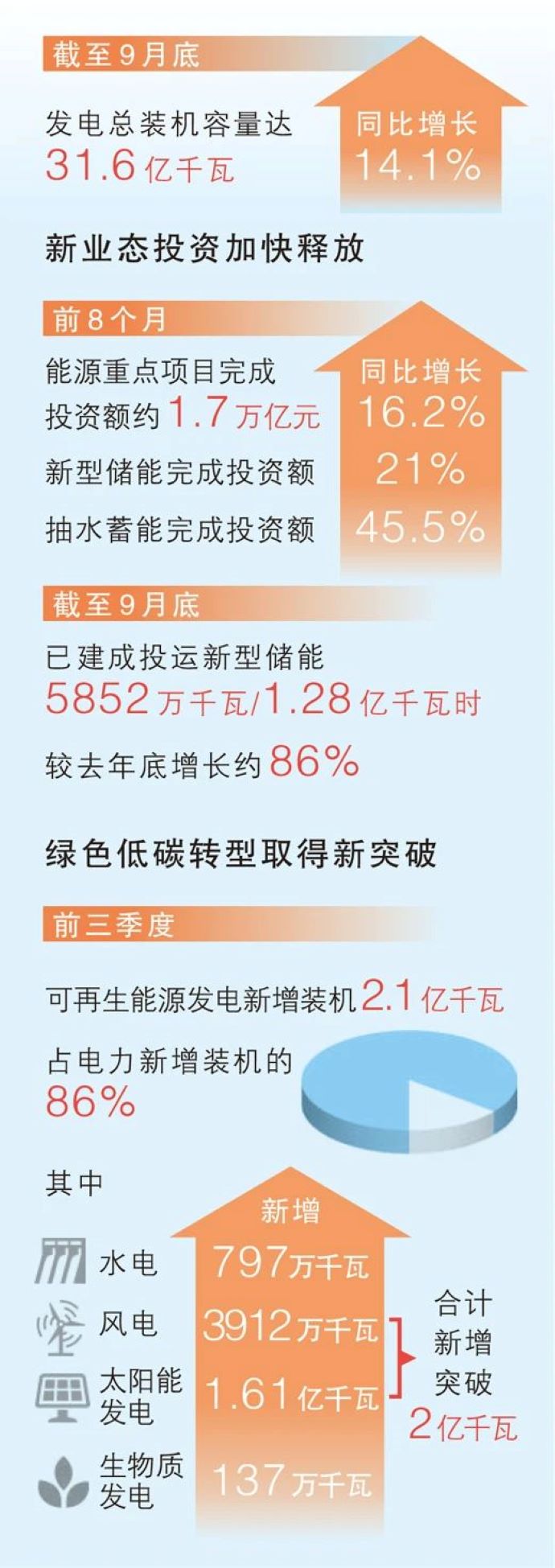 今年以來,我國能源綠色低碳轉(zhuǎn)型不斷取得新突破。前三季度,全國可再生能源發(fā)電新增裝機2.1億千瓦,同比增長21%,占電力新增裝機的86%。其中,水電新增797萬千瓦,風(fēng)電新增3912萬千瓦,太陽能發(fā)電新增1.61億千瓦,生物質(zhì)發(fā)電新增137萬千瓦,風(fēng)電太陽能發(fā)電合計新增突破2億千瓦。截至9月底,全國可再生能源裝機達到17.3億千瓦,同比增長25%,約占我國總裝機的54.7%。