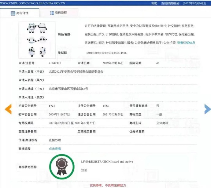 北京冬奧就中英文名稱“冰墩墩”“Bing Dwen Dwen”及其三維標(biāo)志在全部45個(gè)類別的商標(biāo)于2020年獲準(zhǔn)注冊(cè)。