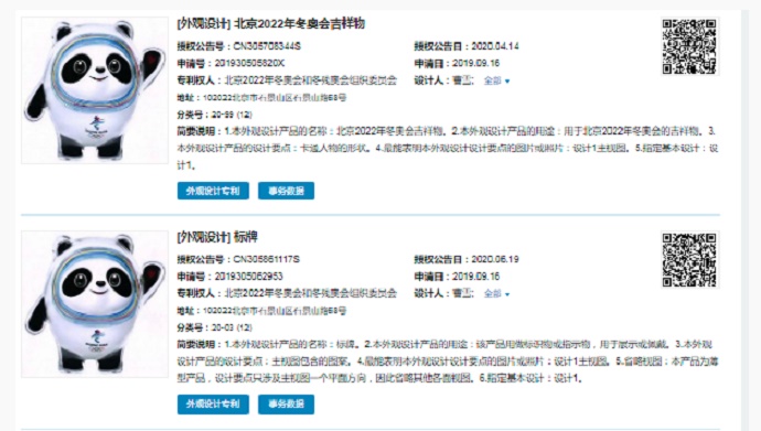 2019年9月,北京冬奧組委向國(guó)家知識(shí)產(chǎn)權(quán)局提交了4件與冰墩墩相關(guān)的外觀設(shè)計(jì)專利,并于2020年獲得授權(quán)。