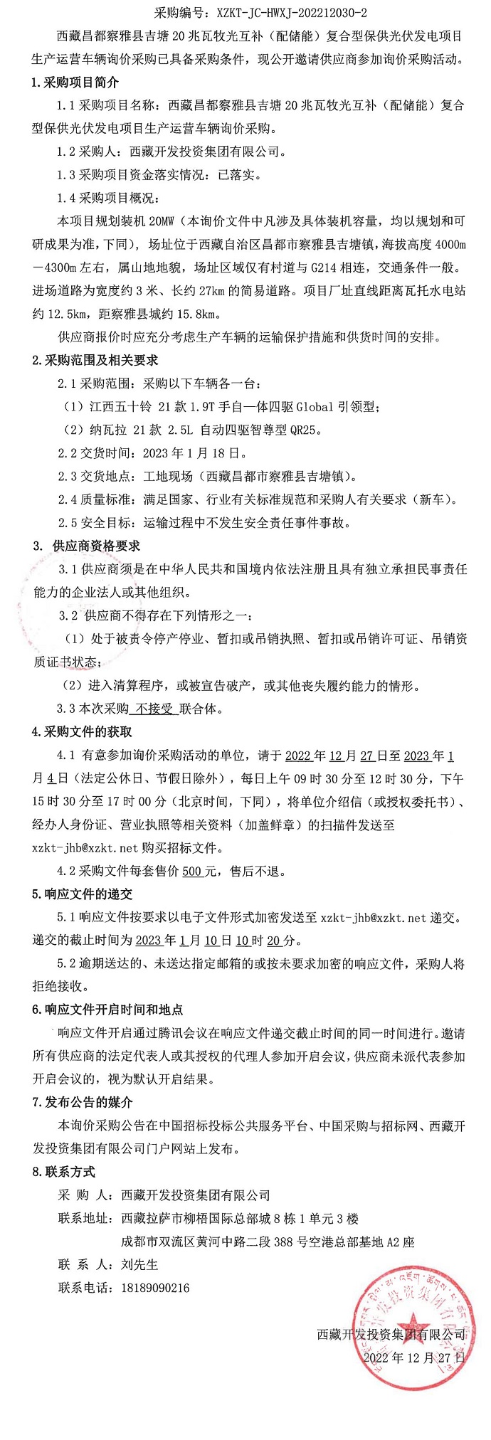 西藏昌都察雅縣吉塘20兆瓦牧光互補(配儲能)復合型保供光伏發電項目生產運營車輛詢價采購二次公告