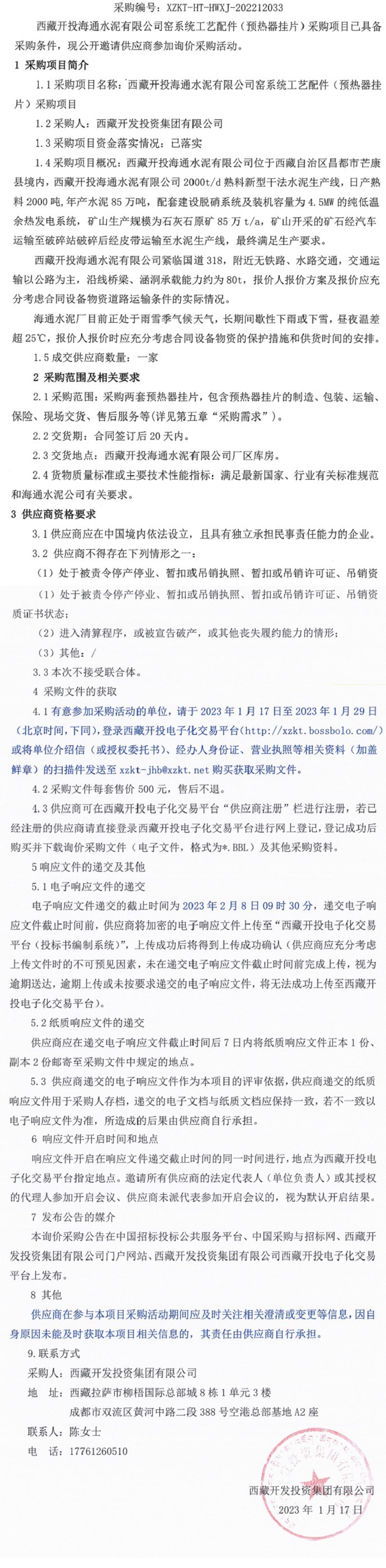 西藏開投海通水泥有限公司窯系統(tǒng)工藝配件(預熱器掛片)采購項目詢價采購公告