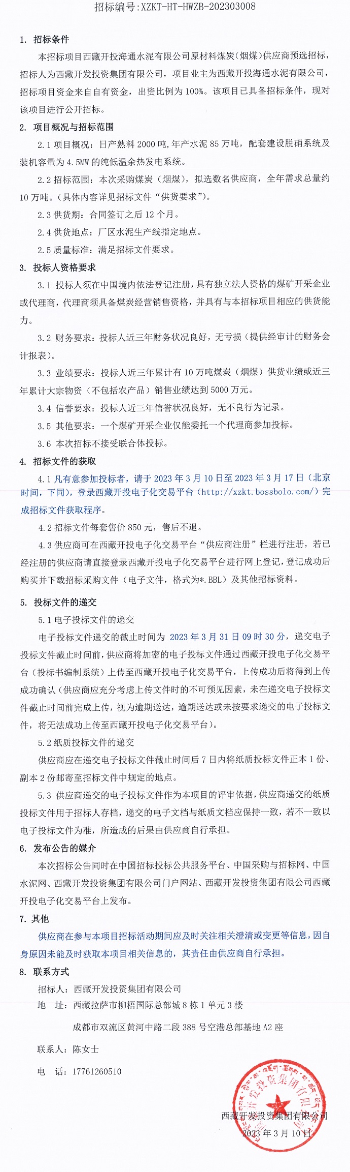 西藏開投海通水泥有限公司原材料煤炭(煙煤)