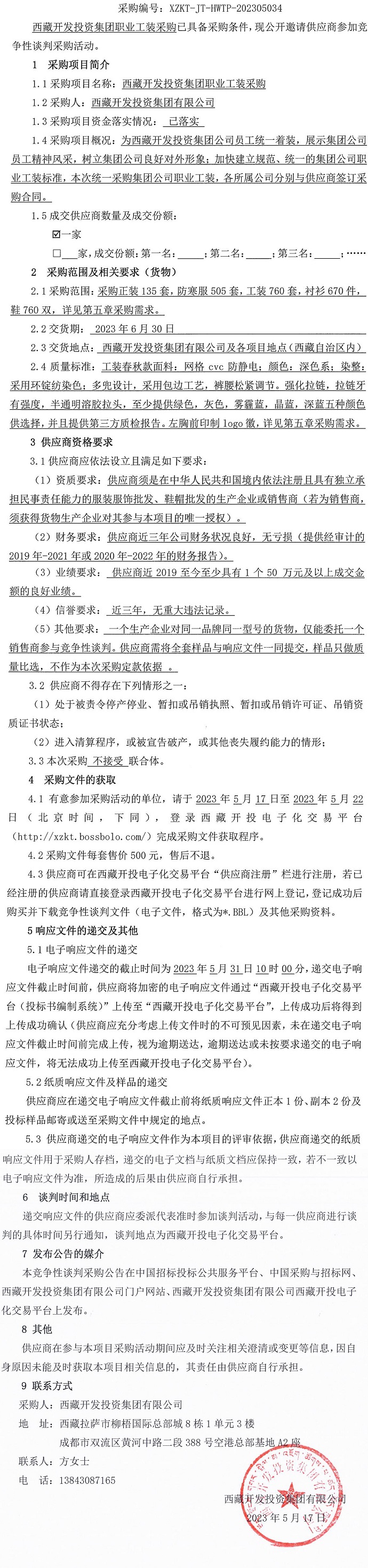 西藏開發投資集團職業工裝采購競爭性談判采購公告