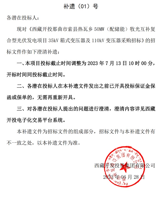 西藏開投那曲市索縣熱瓦鄉50MW(配儲能)牧光互補復合型光伏發電項目35kV箱式變壓器及110kV變壓器采購招標