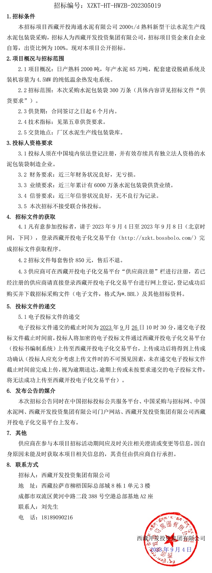 西藏開投海通水泥有限公司2000t/d熟料新型干法水泥生產線水泥包裝袋采購招標公告