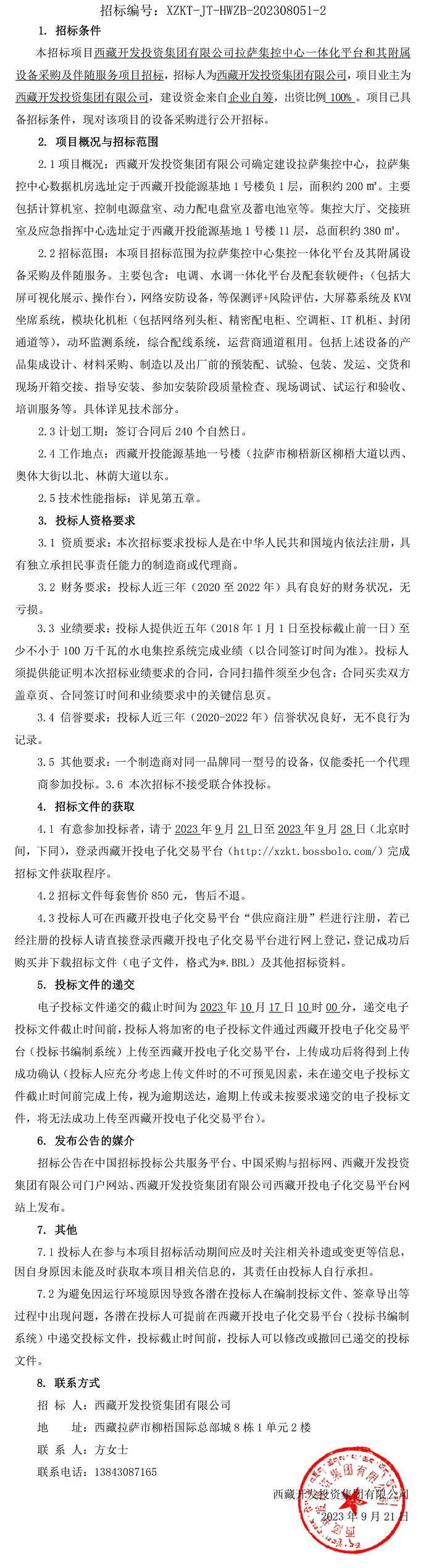 西藏開發投資集團有限公司拉薩集控中心一體化平臺和其附屬設備采購及伴隨服務項目招標公告(第二次)