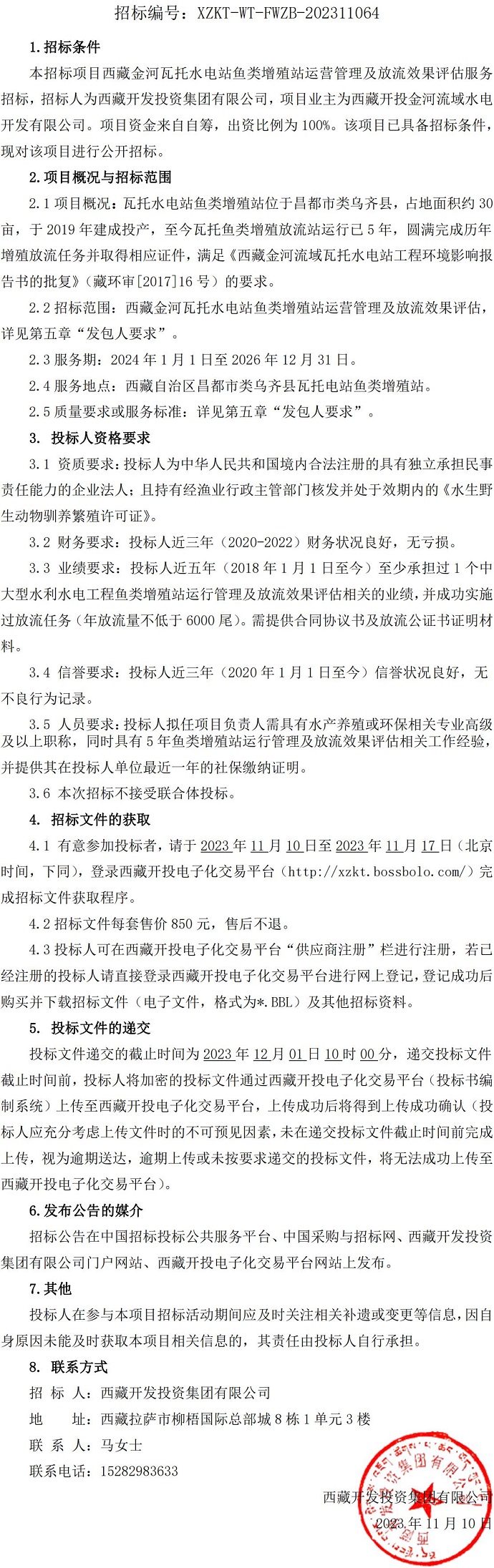 西藏金河瓦托水電站魚類增殖站運營管理及放流效果評估服務招標公告