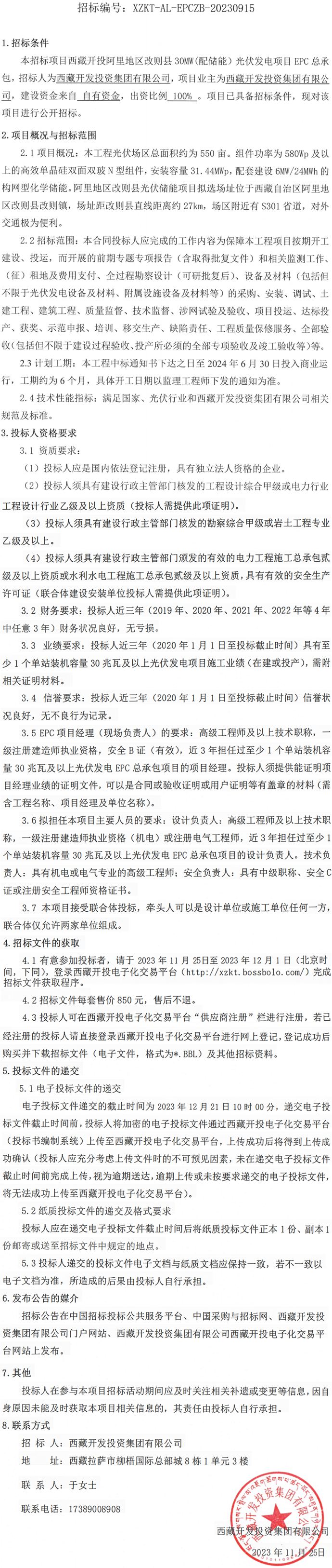 西藏開投阿里地區(qū)改則縣30MW(配儲能)光伏發(fā)電項目EPC總承包招標公告