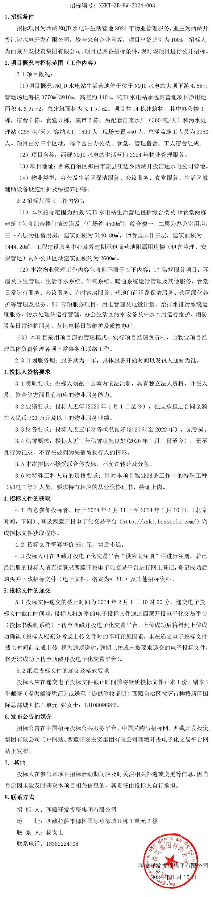 西藏 NQJD 水電站生活營地 2024 年物業管理服務招標公告
