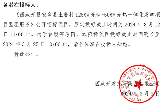 光熱一體化發電項目監理服務》投標截止時間的公告