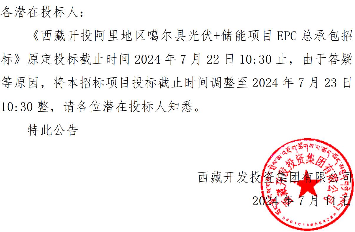 關于延長《西藏開投阿里地區噶爾縣光伏+儲能項目EPC總承包招標》投標截止時間的公告