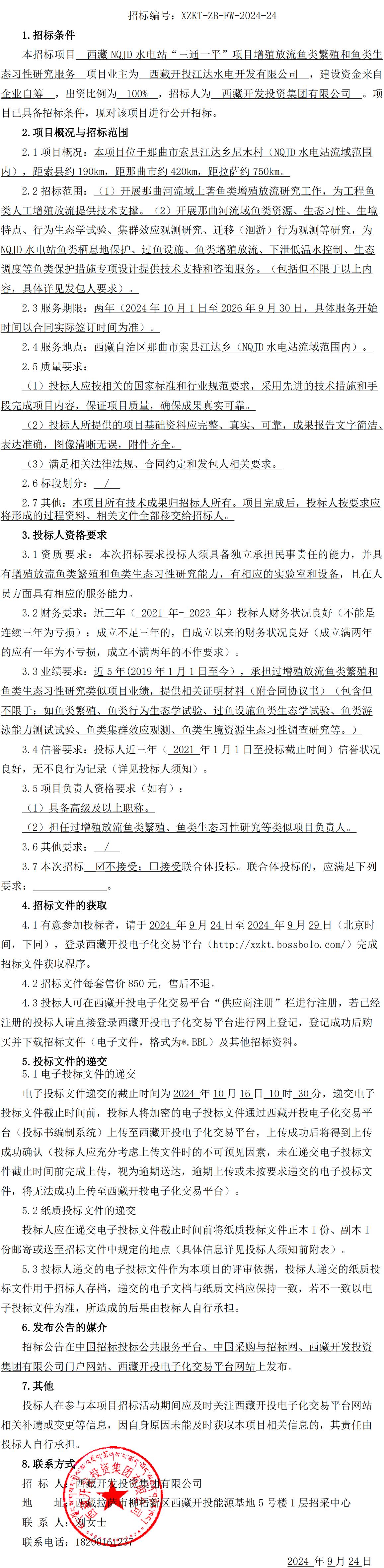 西藏 NQJD 水電站“三通一平”項目增殖放流魚類繁殖和魚類生態習性研究服務招標公告