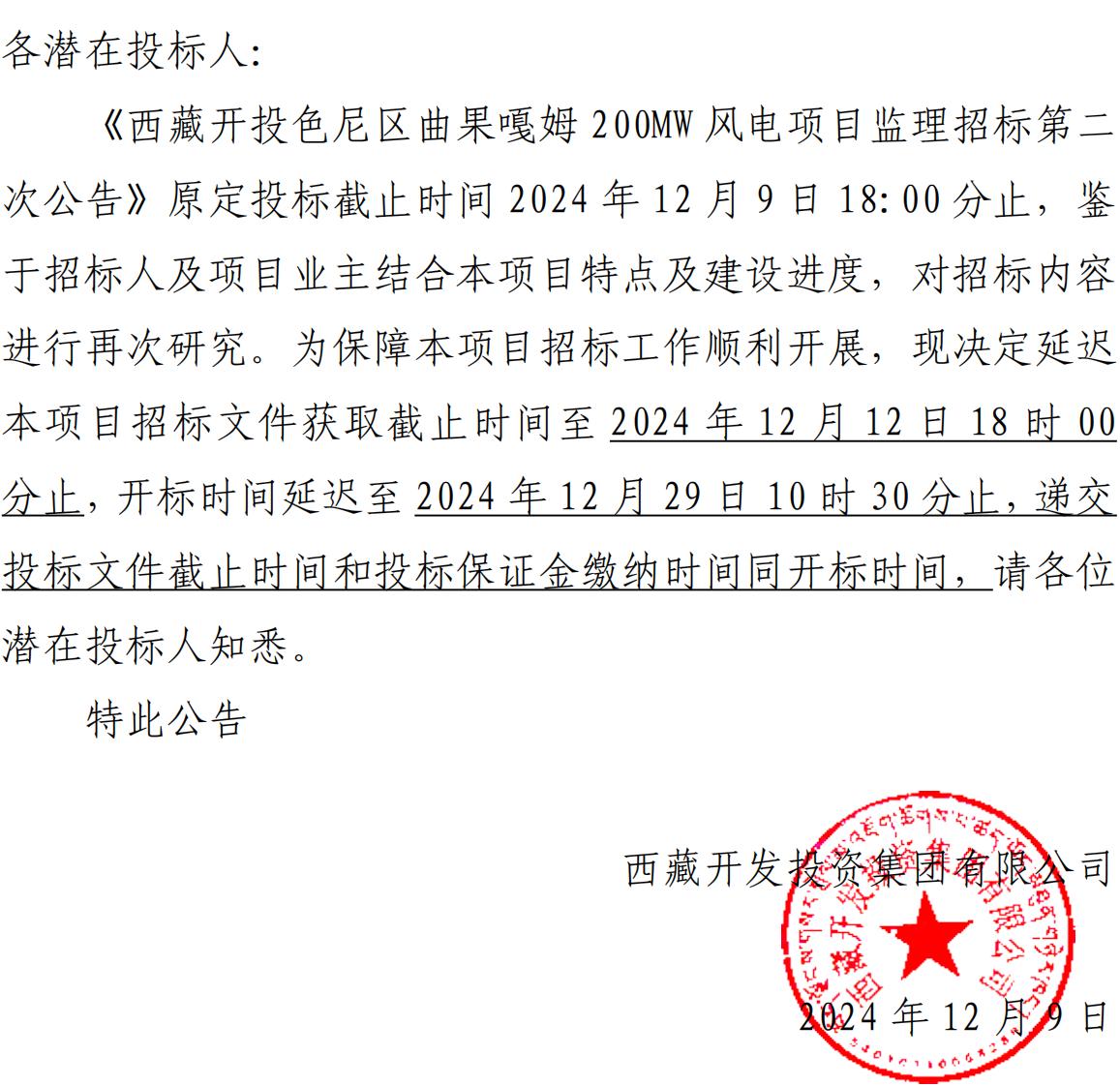 關于延長《西藏開投色尼區曲果嘎姆200MW風電項目監理招標第二次公告》投標截止時間的公告