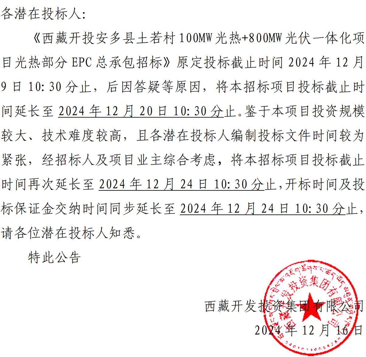 關于再次延長《西藏開投安多縣土碩 100MW光熱+800MW 光伏一體化項目光熱部分 EPC總承包招標》投標截止時間的公告