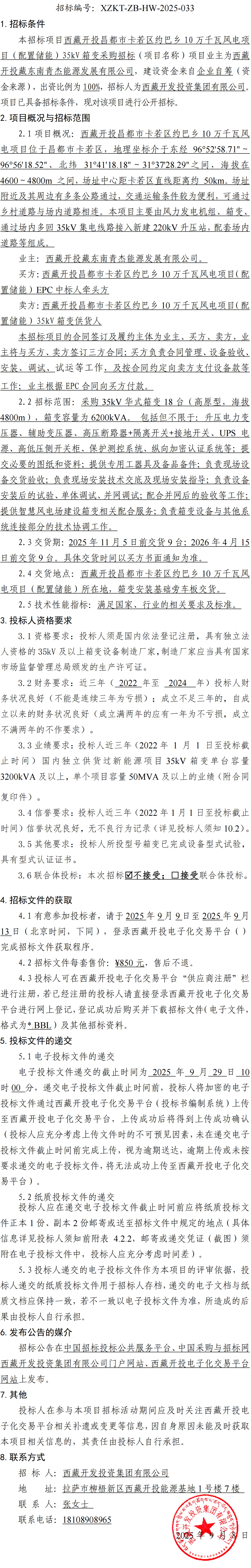 西藏開投昌都市卡若區約巴鄉10萬千瓦風電項目(配置儲能)35kV 箱變采購招標公告
