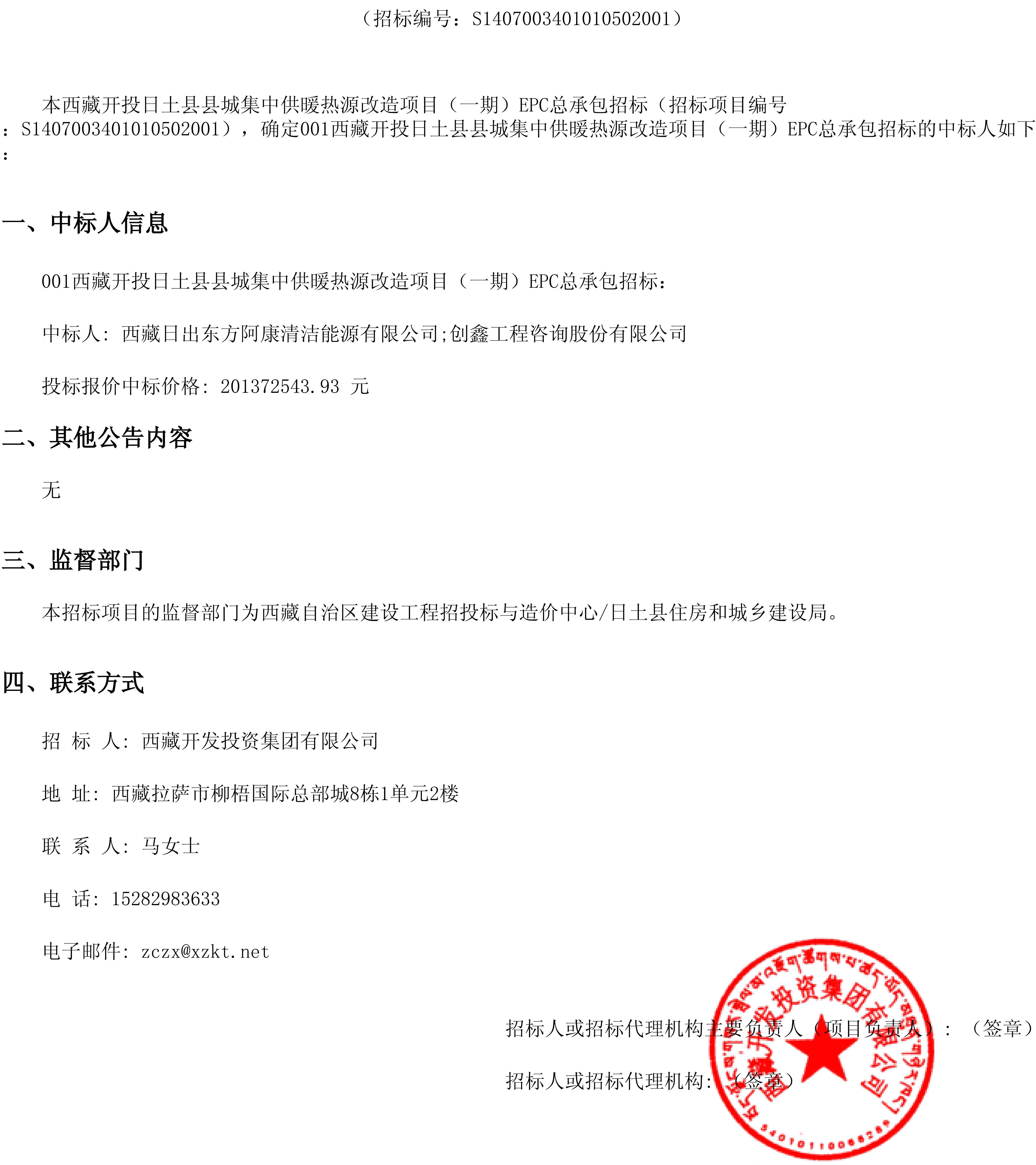 西藏開投日土縣縣城集中供暖熱源改造項目(一期)EPC總承包招標項目中標結果公告